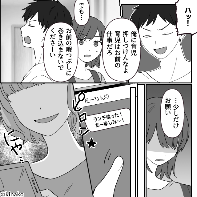 泣きそうな毎日のなか、公園で声をかけてくれたママ友の存在が唯一の救いでした。 ある日、ママ友のスマホに「だーりん」という名前で通知が届いたのです。 ママ友の夫婦関係の良さを感じ、その微笑ましい画面が今の私にはあまりにも眩しく、羨ましくて胸が締めつけられる思いでした。