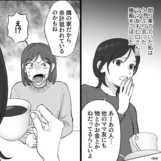 困惑して別のママ友に相談すると「あの人は有名な『クレクレ星人』だよ。隣だから標的にされたのかも」と衝撃の事実を告げられました。