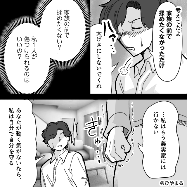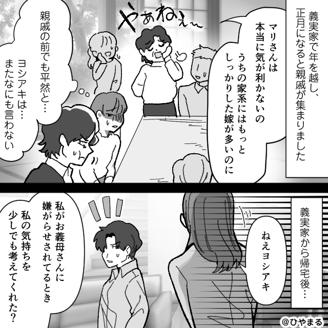 ましてや、嫁の自分にだけ厳しく当たられたり、親戚の前で恥をかかされたりしたら、すぐにでも帰りたくなるもの。 しかも夫は、嫌がらせを受ける嫁を見て見ぬふり――。