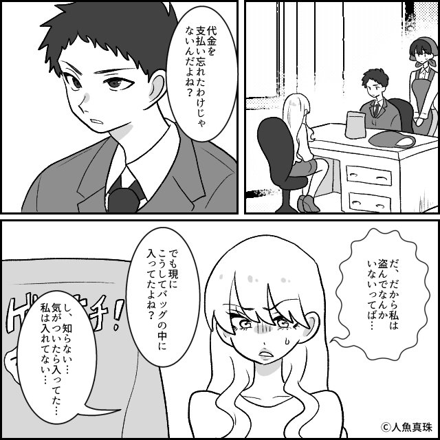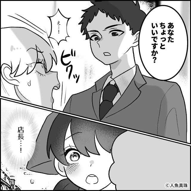 ビクッとして立ちすくむ女性を、店長は事務室へ連れて行きます。