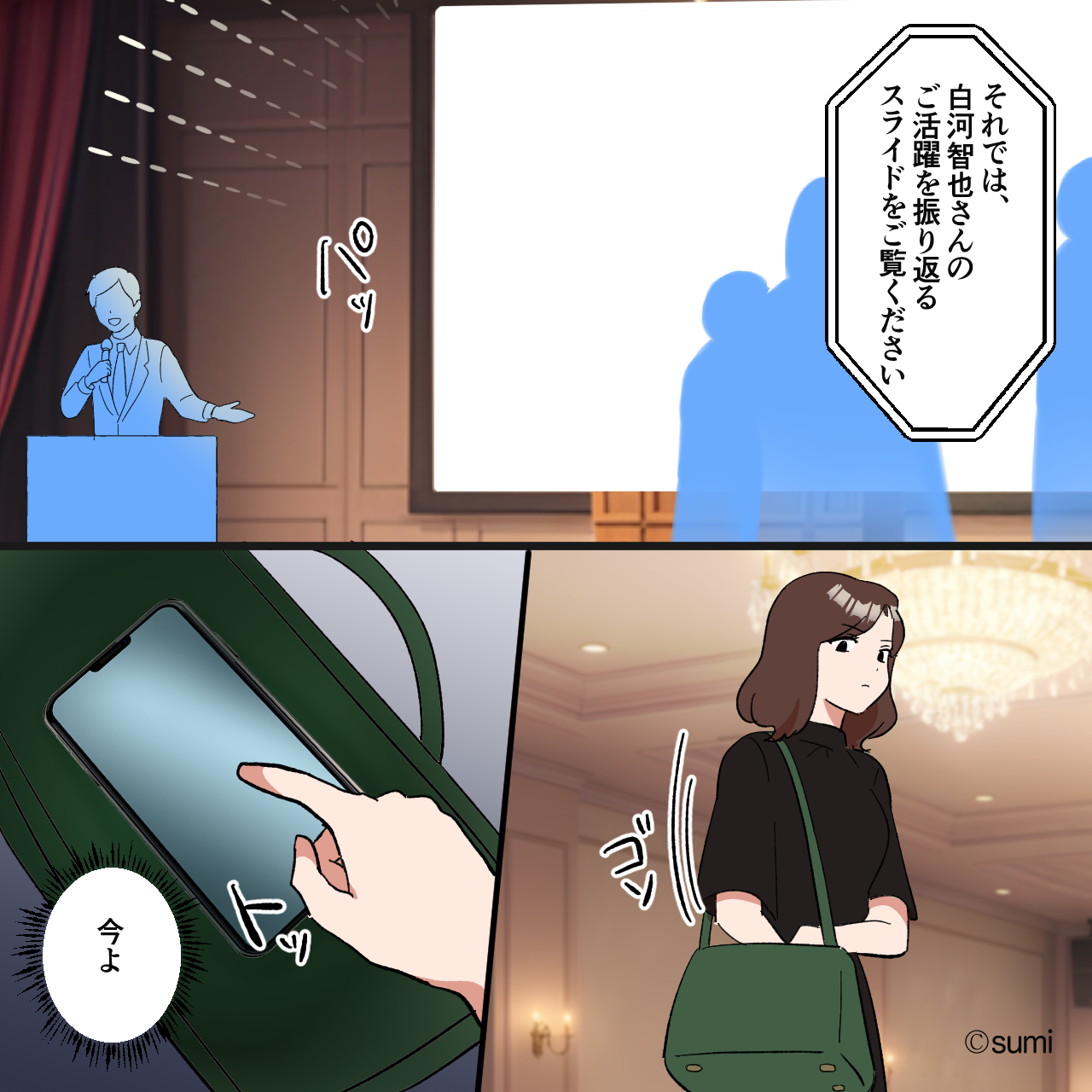 会社での夫のクリーンなイメージに似合わぬ動画に、会場は騒然としています。