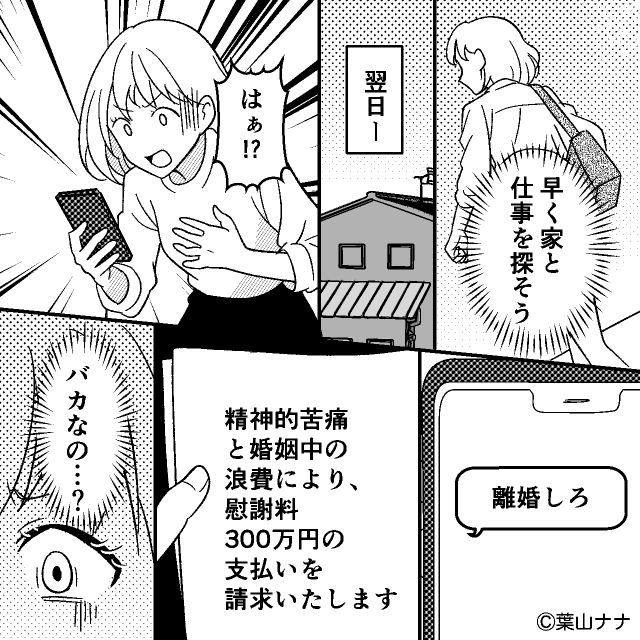 「精神的苦痛と婚姻中の浪費により、慰謝料300万円の支払いを請求いたします」という文字。