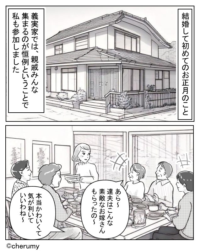 嫁として義実家での親戚の集まりに参加するときは、緊張するもの。 そんなときに親戚たちから褒められるとホッとする反面、なぜか義母だけが冷たかったら…。