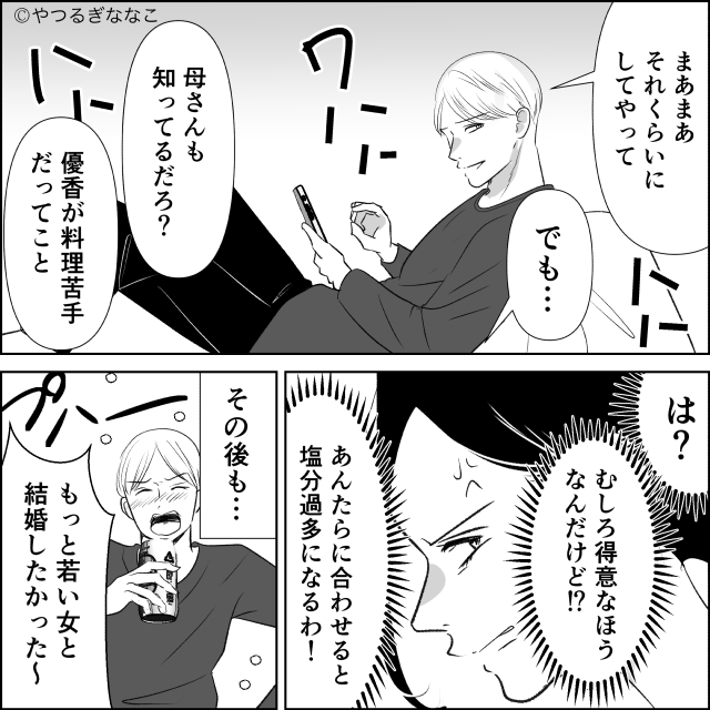 「まあまあそれくらいにしてやって。母さんも知ってるだろ?妻が料理苦手だってこと」