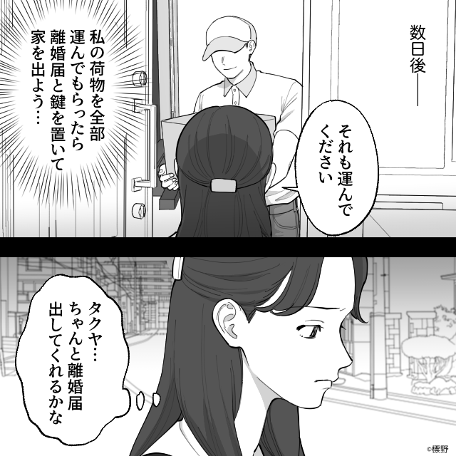 (私の荷物を全部運んでもらったら、離婚届と鍵を置いて、家を出よう…。)