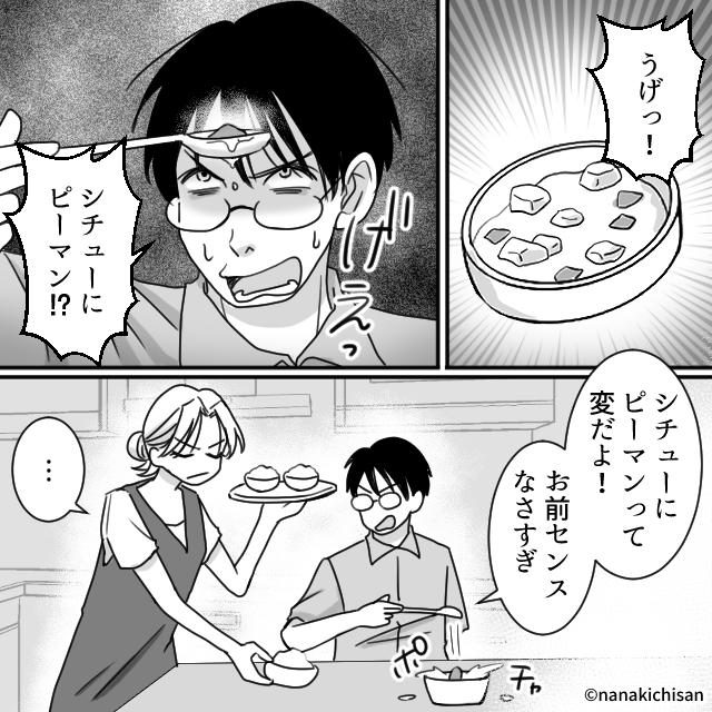 すると夫は、わざとらしくピーマンをシチューに落とします。
