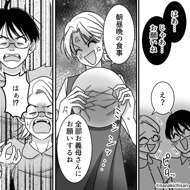 「朝昼晩の食事、全部お義母さんにお願いするね」