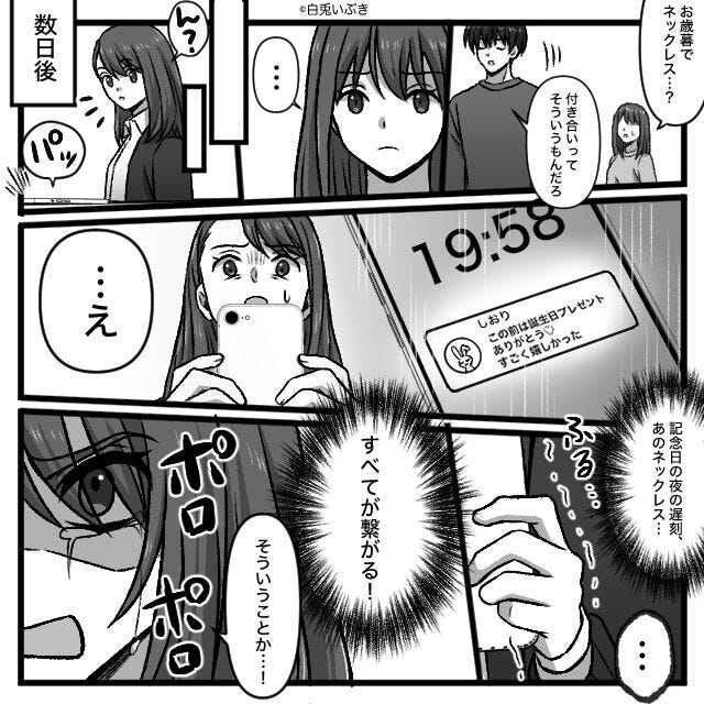 そして翌朝、夫のカバンの中に、箱に入った有名ブランドのネックレスを発見。
