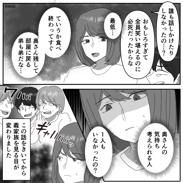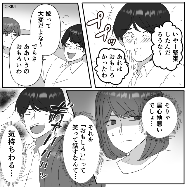 緊張している人の気持ちを想像せず、ただ「おもしろい」と盛り上がる夫や義両親の姿に、心底がっかりするのも当然でしょう。