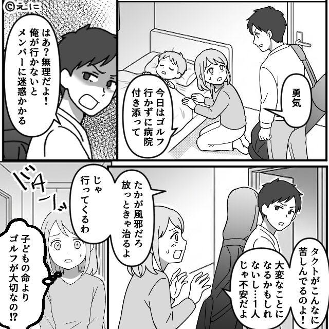 息子の体調不良時に「放っときゃ治る」ゴルフに行った夫。だが翌日⇒「代償を払ってもらう」妻の【容赦ない反撃】で夫は絶望!?
