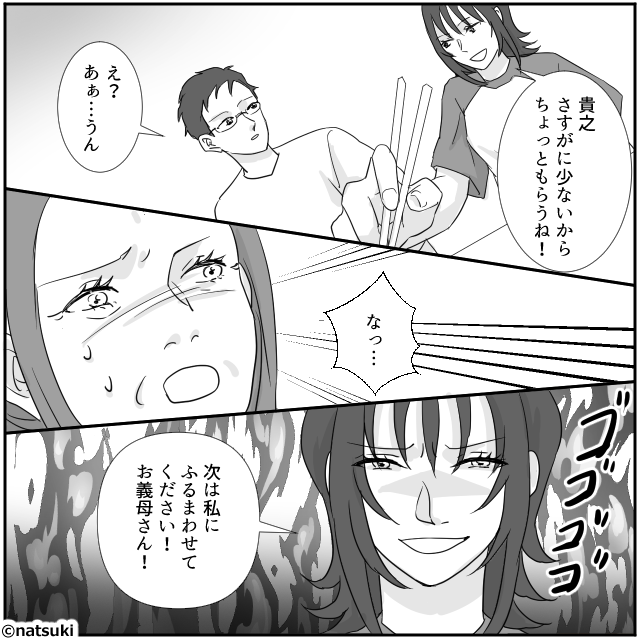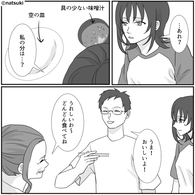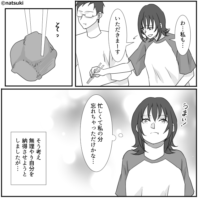 おかずがなければ夫から奪い、足りなければ「もっと食べたいです」と笑顔でリクエストする。