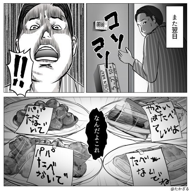 夜中にこっそりつまみ食いをしようとした夫は、その異様な光景に絶句。