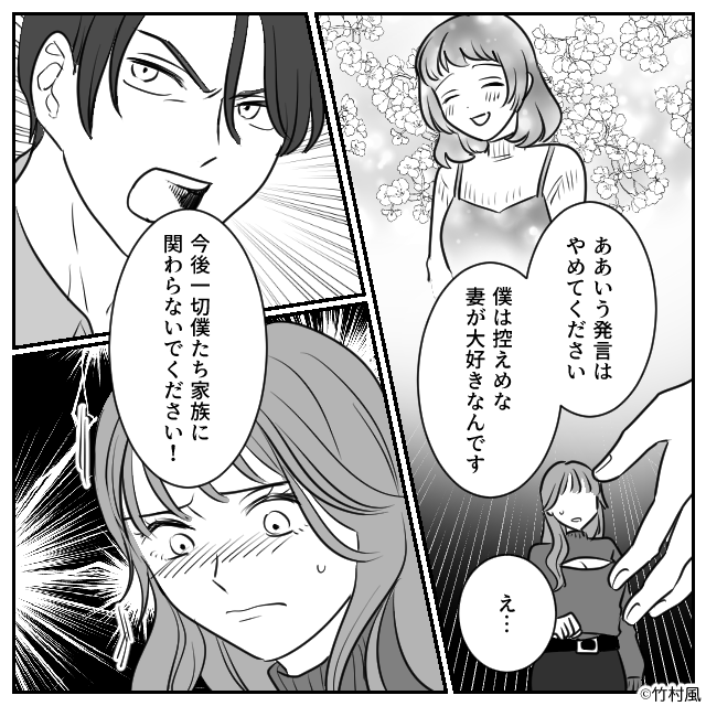 「あぁいう発言はやめてください。僕は控えめな妻が大好きなんです。今後一切僕たち家族に関わらないでください!」