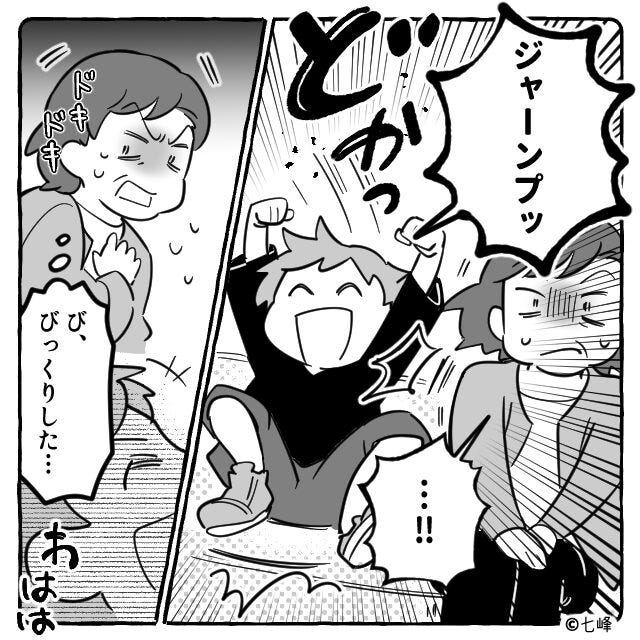 次の瞬間、その男の子は私の隣の席にジャンプして飛び乗ったんです。 ぶつかりそうな衝撃に、思わず体が固まりました。