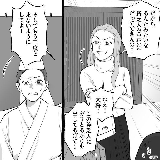 「ねぇ!大将!この貧乏人を2度と来ないようにしてよ!」