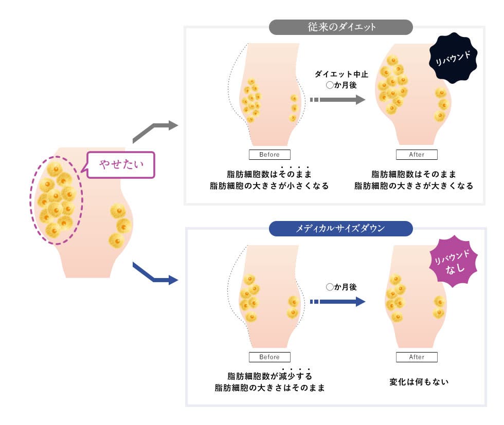 「リバウンドしたくない」「部分痩せしたい」というニーズに応え、「メディカルサイズダウン」は医療の力で“細胞”に直接効かせ、希望部位だけ簡単に痩せることができるんだそう!