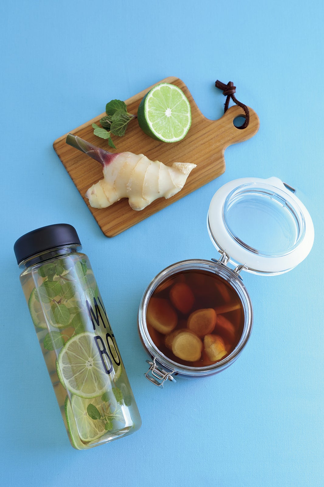3. 2のジンジャーシロップ適量をグラスに注ぎ、冷えた炭酸水で割る。好みでスライスしたライムやミントの葉を加えて混ぜる。