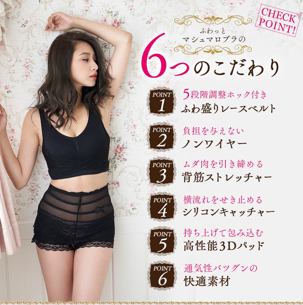 「ふわっとマシュマロブラ」は、バストをぐっと中央に寄せあげる特殊製法の5段階調整ホック付きで、バストケアも期待できるナイトブラ。