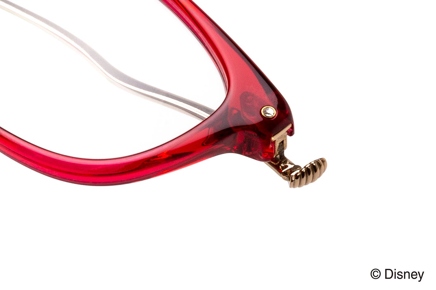 ジャスミンシリーズのテンプル(つる)は、しなやかにカールした黒髪と髪飾りをイメージ。他にも、ジャスミンのサインや、魔法の絨毯やクジャクの模様の彫刻されたフロントサイドなど、作品の世界観をトレンドに落とし込んだデザインも人気の理由なんです。