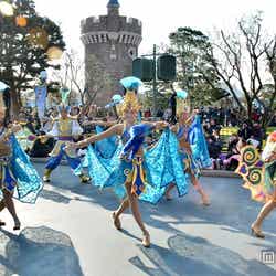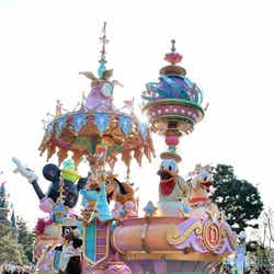 同パレードは、ディズニーの仲間たちのさまざまな“ハピネス”をテーマに開催。7つのユニット、13台のフロート、出演キャラクター数55名で構成され、全長500mにおよぶ色鮮やな心躍る壮大なパレードとなっている。これまでは通過型のパレードだったが、期間限定でフロートがストップしてパフォーマンスする停止スタイルにバージョンアップ。途中3カ所で停止し、ゲストは手振りや手拍子などで参加することが可能に。さらに、停止中の曲はエリアごとで一部異なるため、鑑賞場所によっても毎回違った楽しみ方ができる。
