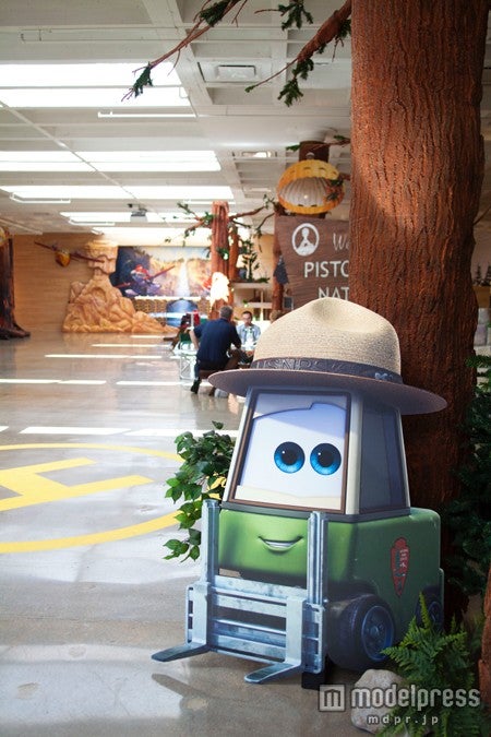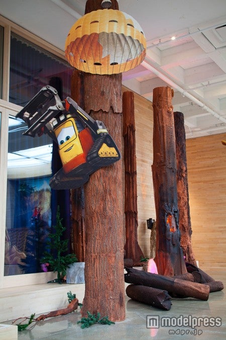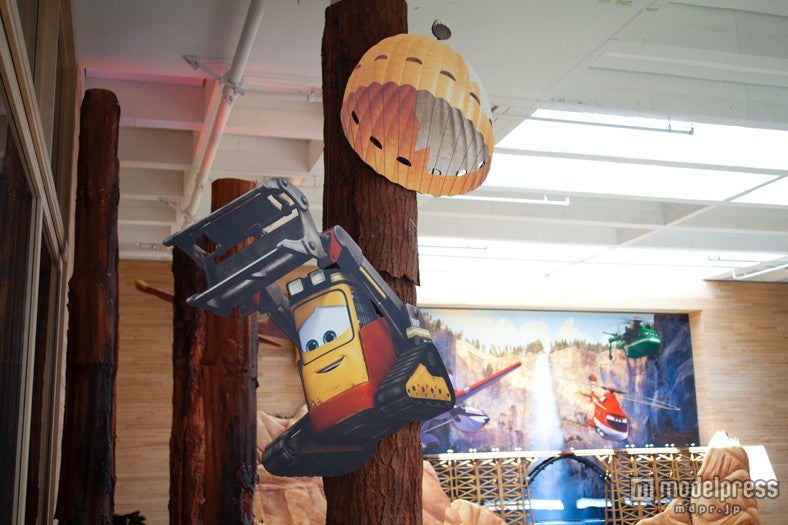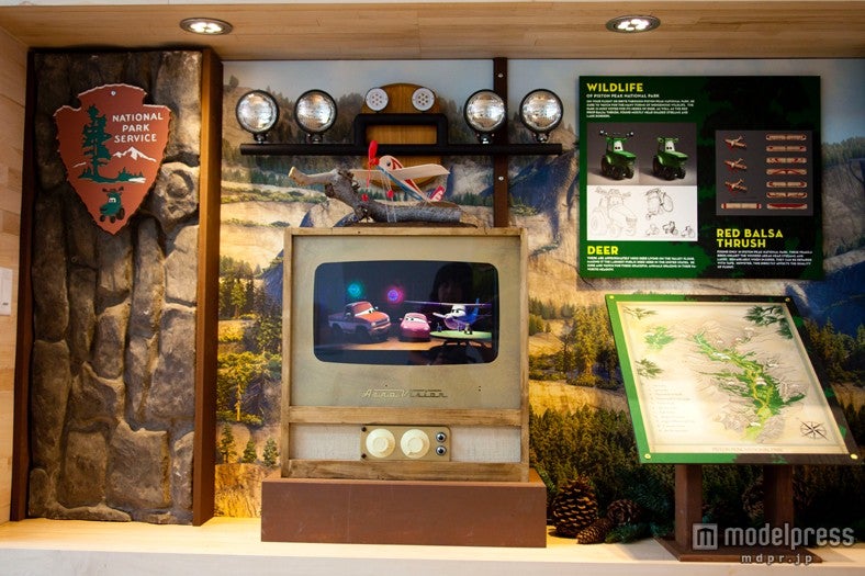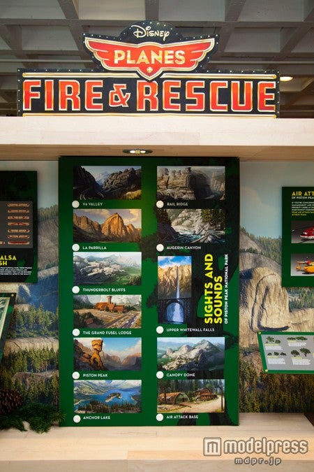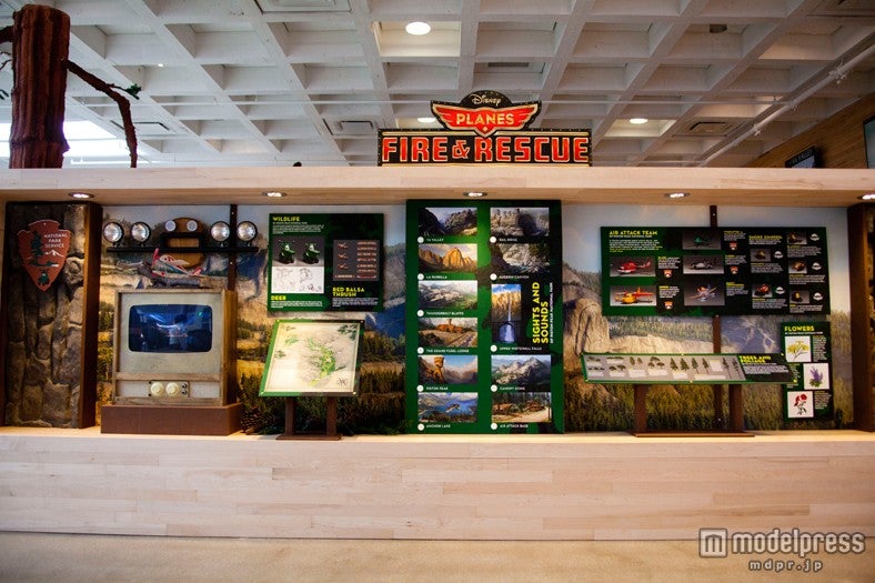 『プレーンズ2』の名シーンが描かれた大きな扉に胸を躍らせ、スタジオに足を踏み入れると、思わず「わぁ~!」と声を上げてしまう。「Welcome to PISTON PEAK NATIONAL PARK」と書かれた大きな看板が示す通り、ダスティがレスキュー隊の仲間と共に飛び回る「ピストン・ピーク国立公園」の世界観が再現されたロビー。小型の地上作業車“パラシュート隊”がそれぞれの作業に勤しむ様子を眺めながら進むと、奥にはレスキュー隊を率いるクールなボス、ブレード・レンジャーと、彼の元で訓練に励むダスティ、そして物語のキーとなる渓谷橋の大きな模型がある。