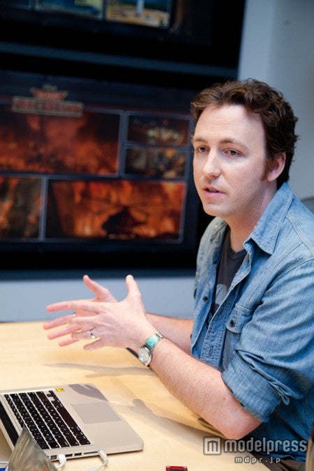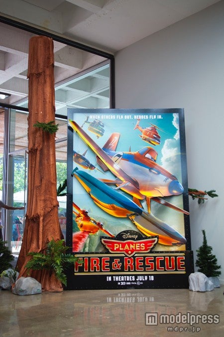 ロサンゼルスの中心地から車を走らせること約30分。緑が広がる山間のカリフォルニア州グレンデールにディズニートゥーン・スタジオは位置する。『アナと雪の女王』が生まれたウォルト・ディズニー・アニメーション・スタジオと同じく、『カーズ』『プレーンズ』の生みの親であるジョン・ラセター氏がチーフ・クリエイティヴ・オフィサーをつとめ、今回の『プレーンズ2』も同氏が製作総指揮を担当。同スタジオ作品には2008年に日本公開された『ティンカー・ベル』があり、その後シリーズ化されている。『プレーンズ2』の名シーンが描かれた大きな扉に胸を躍らせ、スタジオに足を踏み入れると、思わず「わぁ~!」と声を上げてしまう。「Welcome to PISTON PEAK NATIONAL PARK」と書かれた大きな看板が示す通り、ダスティがレスキュー隊の仲間と共に飛び回る「ピストン・ピーク国立公園」の世界観が再現されたロビー。小型の地上作業車“パラシュート隊”がそれぞれの作業に勤しむ様子を眺めながら進むと、奥にはレスキュー隊を率いるクールなボス、ブレード・レンジャーと、彼の元で訓練に励むダスティ、そして物語のキーとなる渓谷橋の大きな模型がある。