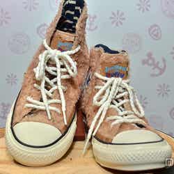 大階段正面には、7月3日より販売する新グッズとメニューを展示。メニュー4種類をパネルにて紹介し、スーベニアのランチケース、プレート、カップ、ポップコーンバケットは現物を用意。また、ダッフィーのふわふわをイメージしたスニーカーも展示されている。