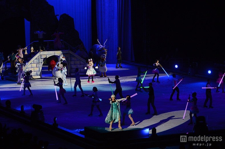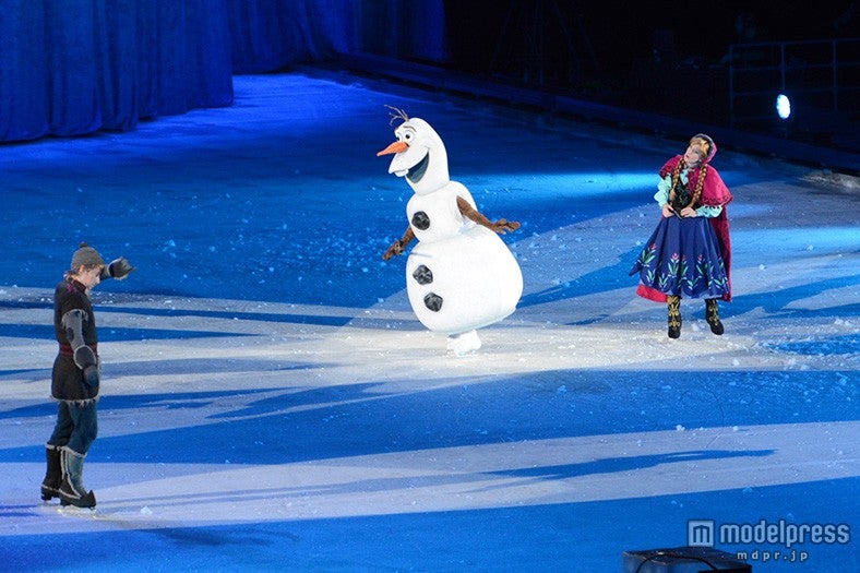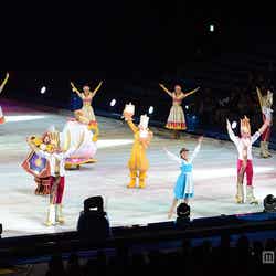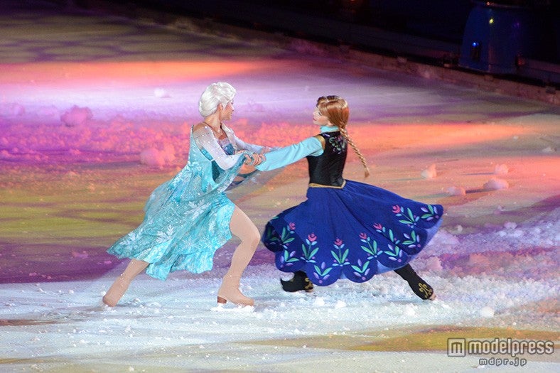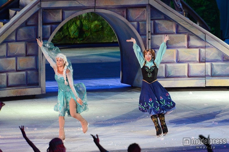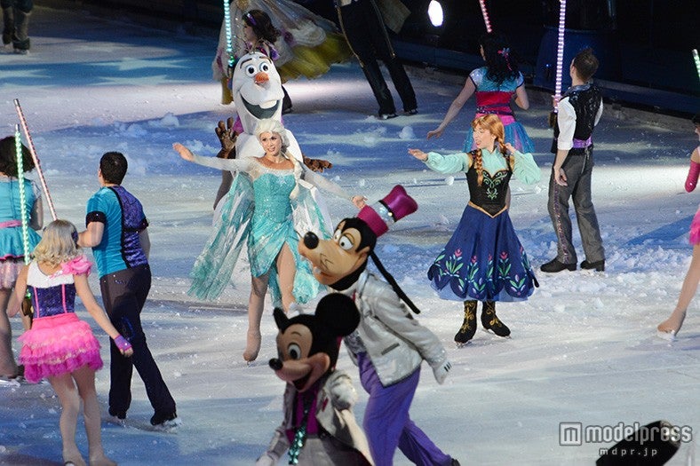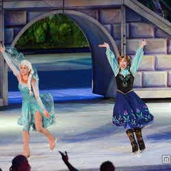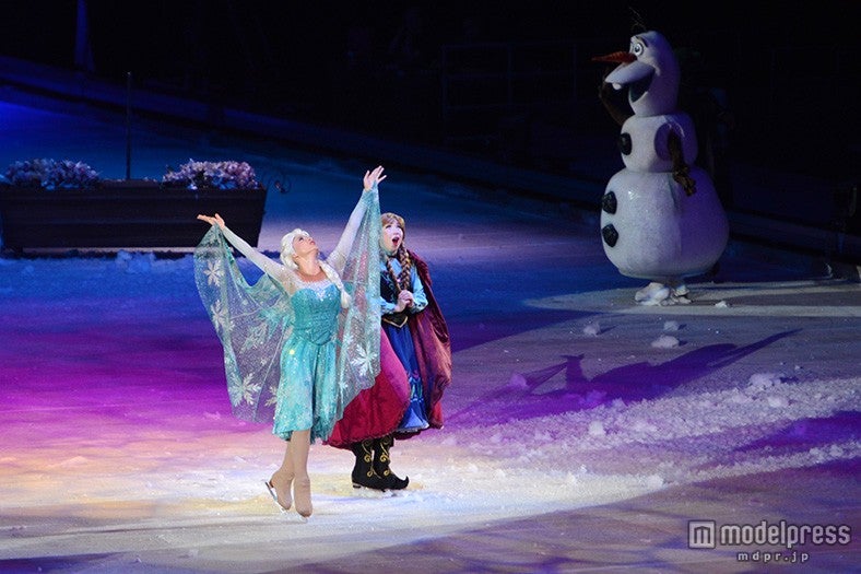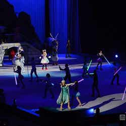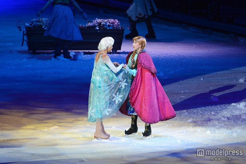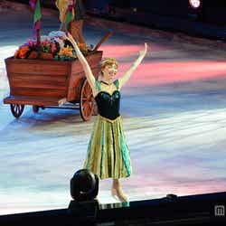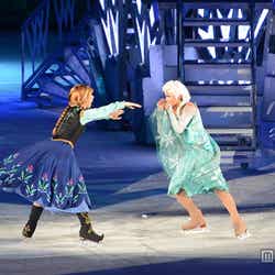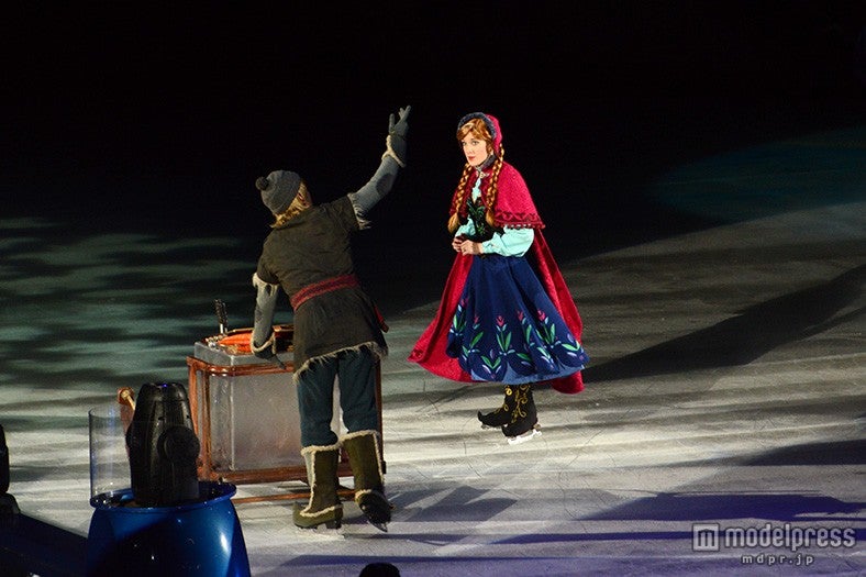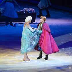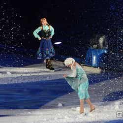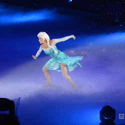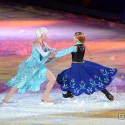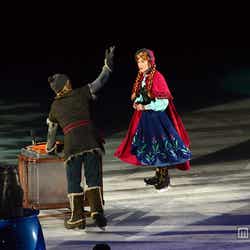 初披露された「アナと雪の女王」のシーンでは、リンク上に雪が舞い、アレンデール王国を再現。「アナ雪」のステージが始まると観客からは歓声の声が上がった。「Let It Go~ありのままで~」をはじめ「生まれてはじめて」「とびら開けて」「あこがれの夏」など数々の名曲にのせて、アナとエルサが観客を映画の世界へ引き込んだ。
