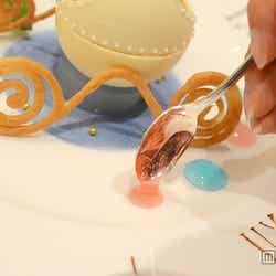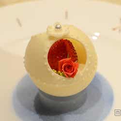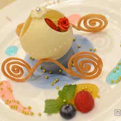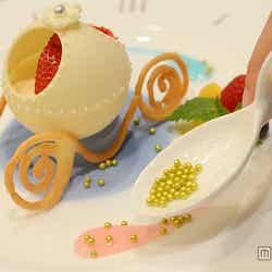 そして、ここでしか味わえないプリンセスがテーマのスイーツが配られ、ティーパーティーの開幕。カボチャの馬車をイメージしたこのスイーツは、ゲストが自らデコレーションをして完成するという“世界にひとつだけの特別なスイーツ”。ゲストにはそれぞれ、ムースが真ん中に盛りつけられた1皿と、デコレーション用の食材が乗った1皿の計2皿を用意。ムースはホワイトチョコレートでできた器に入っており、お皿の周りはシンデレラの物語を思い起こさせる、時計のデコレーション。もう1皿には、ホワイトチョコレートでできたフタと、いちご、ラズベリー、ブルーベリー、オレンジといったフルーツ、ピンクとブルーのソース、トッピング用のトゥインクルアラザンとバラの飾り、そして馬車の車輪をかたどった焼き菓子。