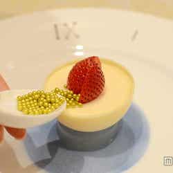ゲストにはそれぞれ、ムースが真ん中に盛りつけられた1皿と、デコレーション用の食材が乗った1皿の計2皿を用意。ムースはホワイトチョコレートでできた器に入っており、お皿の周りはシンデレラの物語を思い起こさせる、時計のデコレーション。もう1皿には、ホワイトチョコレートでできたフタと、いちご、ラズベリー、ブルーベリー、オレンジといったフルーツ、ピンクとブルーのソース、トッピング用のトゥインクルアラザンとバラの飾り、そして馬車の車輪をかたどった焼き菓子。