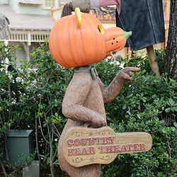 ディズニーランドでは、ディズニーの仲間たちとおばけたちが、大きなかかしの操り人形の下で一緒になって演奏やダンスを楽しんだり、フェアで振る舞われた風変わりなお菓子を食べたりするなど、思い思いの“ハロウィーン・フェア”を楽しんでいる様子を表現したフォトロケーションが、プラザやエントランスに登場。
