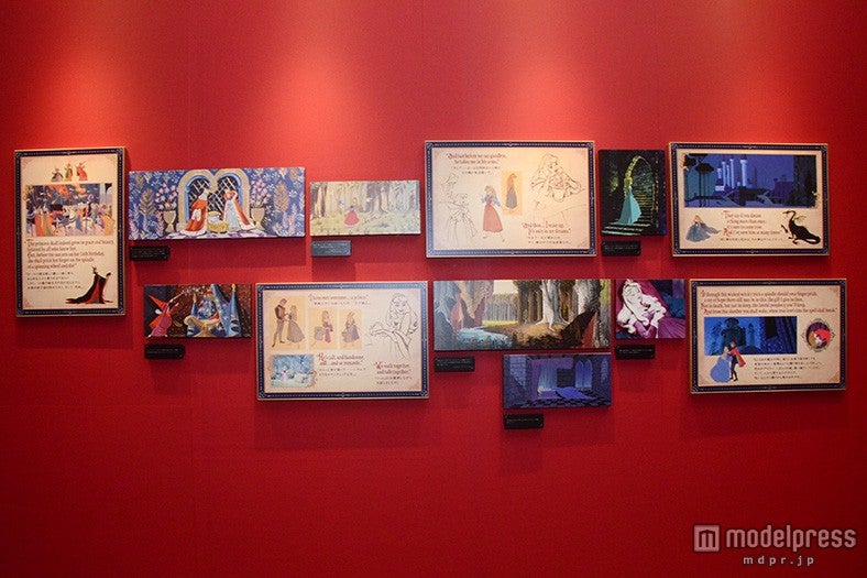 このほか、同会場限定で展示された、映画『眠れる森の美女』のオープニングを飾る絵本の表紙。オーロラ姫の高貴さが色とりどりの宝石で表現されている。同作は当時、ウォルトが制作したものの中でも多額の制作費をかけた豪華なアニメーション映画であった。