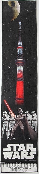 また、JAPANESE ORIGINALコーナーとして「浮世絵スター・ウォーズ」の原画展示なども実施。さらに、最高到達点451.2メートルでは、柱をライトセーバーの色にライトアップさせ、光と音による動きのある演出を行うなど、宇宙のような空間と地上450メートルの浮遊感が織りなす東京スカイツリーならではの「スター・ウォーズ」の世界観を演出。