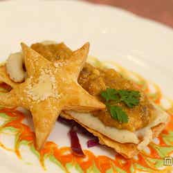 前菜の「ポルチーニのクリームソースとボロネーゼの温かいパイ」は、ツリーをイメージした模様と、星の形をしたパイが印象的。ポルチーニの芳醇な香りとパイのサクサク感を楽しむことができます。