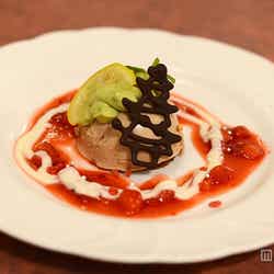 デザートは「キャラメルチョコレートムース」。チョコレートとキャラメルムースの濃厚な味わいをイチゴの甘酸っぱさが引き立たせてくれます。チョコレートがクリスマスツリーになっているなど、ちょっとした遊び心が楽しませてくれますね。