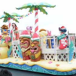 出演キャラクターは、リロ、スティッチ、エンジェル。フロートには、ヤシの木がツリーに見立てられ装飾され、雪だるもサンゴやヒトデなど南国ならではのクリスマスの様子を再現。