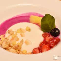 ゲストは、ショーをイメージした料理やドリンクを食べながら参加。「前菜の盛り合わせ(ポテトサラダとビーツ、サーモントラウトとアボカドのガトー仕立て、スウィートチリシュリンプ、チキンのフルーティーサラダ)」、「ローストポーク、粒マスタードとBBQソース、きのこのガーリックバターライス添え」、「ココナッツプリン、ドラゴンフルーツとベリーのジュレ」を楽しみながら、ミッキーマウスたちと一緒に盛り上がった。途中、ディズニーの仲間たちがステージを降りてテーブルを回る場面もあり、そこでは一際大きな歓声が。ゲストは、美味しい料理でお腹を、ディズニーの仲間たちとのふれ合いで心を満たされ、満足そうな表情を浮かべていた。