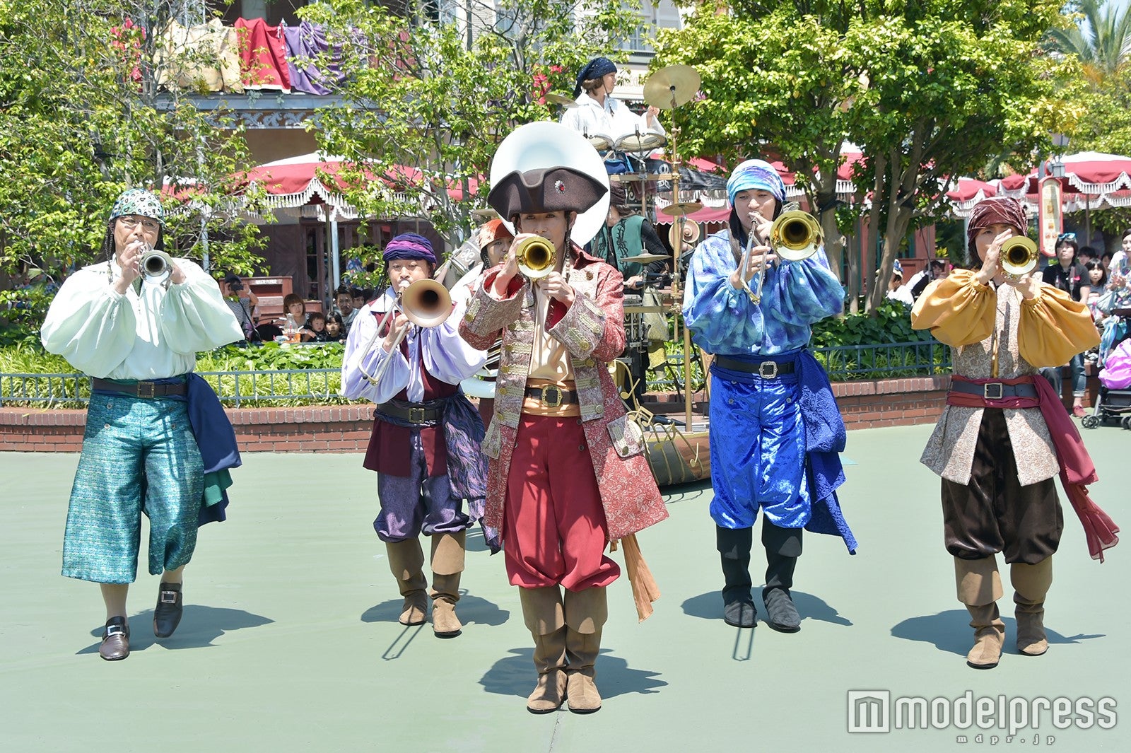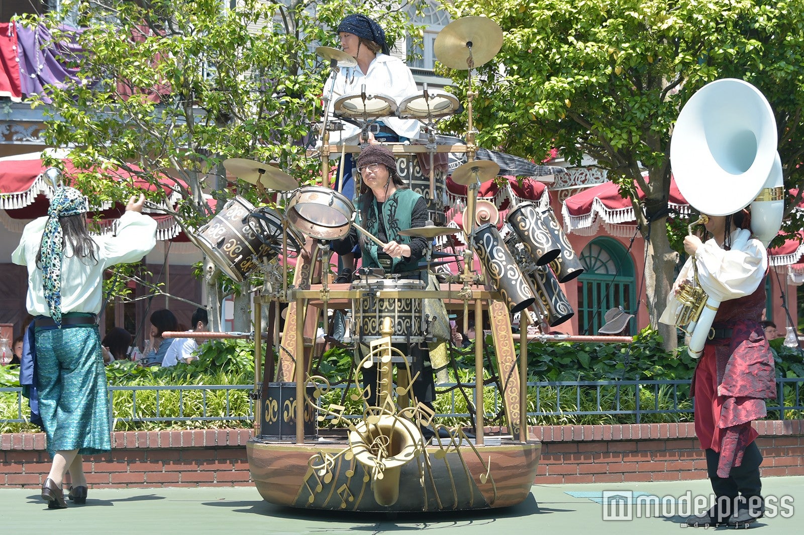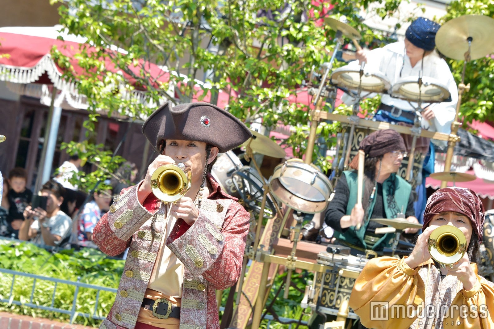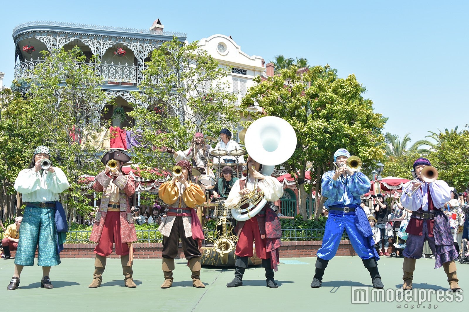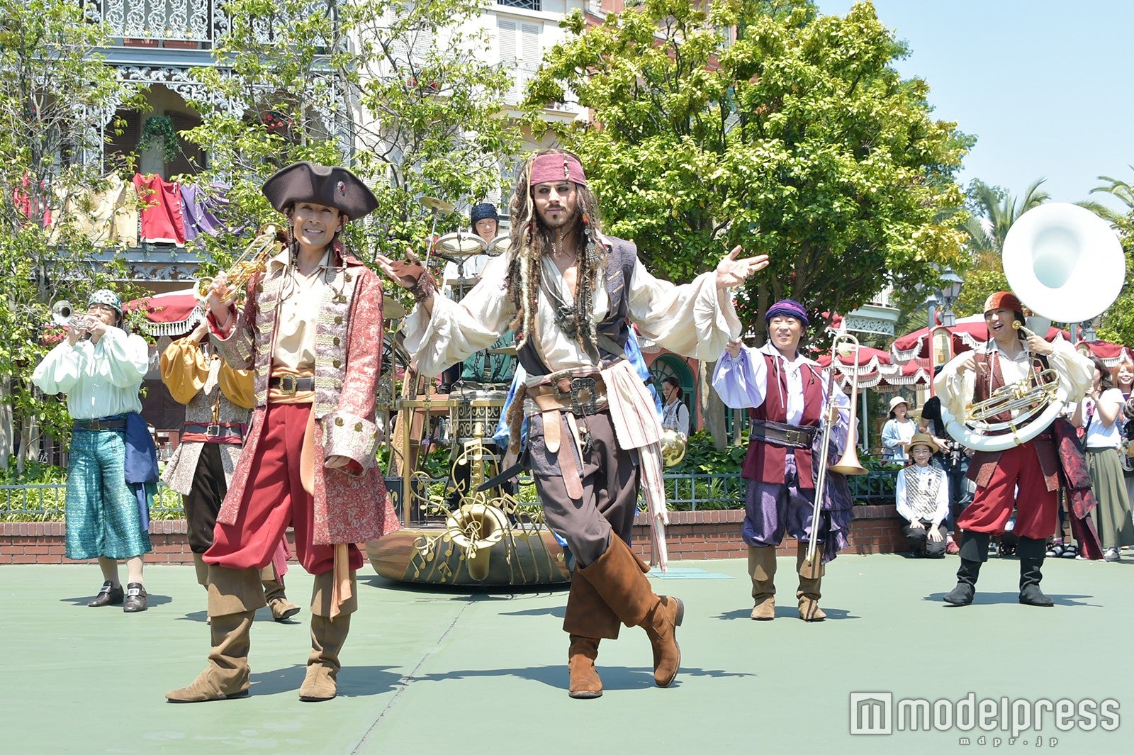 さらに、アトモスフィア・エンターテイメント「パイレーツ・ブラス」はジャック・スパロウが加わり公演。ブラスバンドを組んだ海賊たちが、演奏を披露する同プログラム。途中、ゲストに振りを伝授する場面もあり、辺りは大盛り上がり。最後には、ジャック・スパロウが登場し、盛大に盛り上げた。