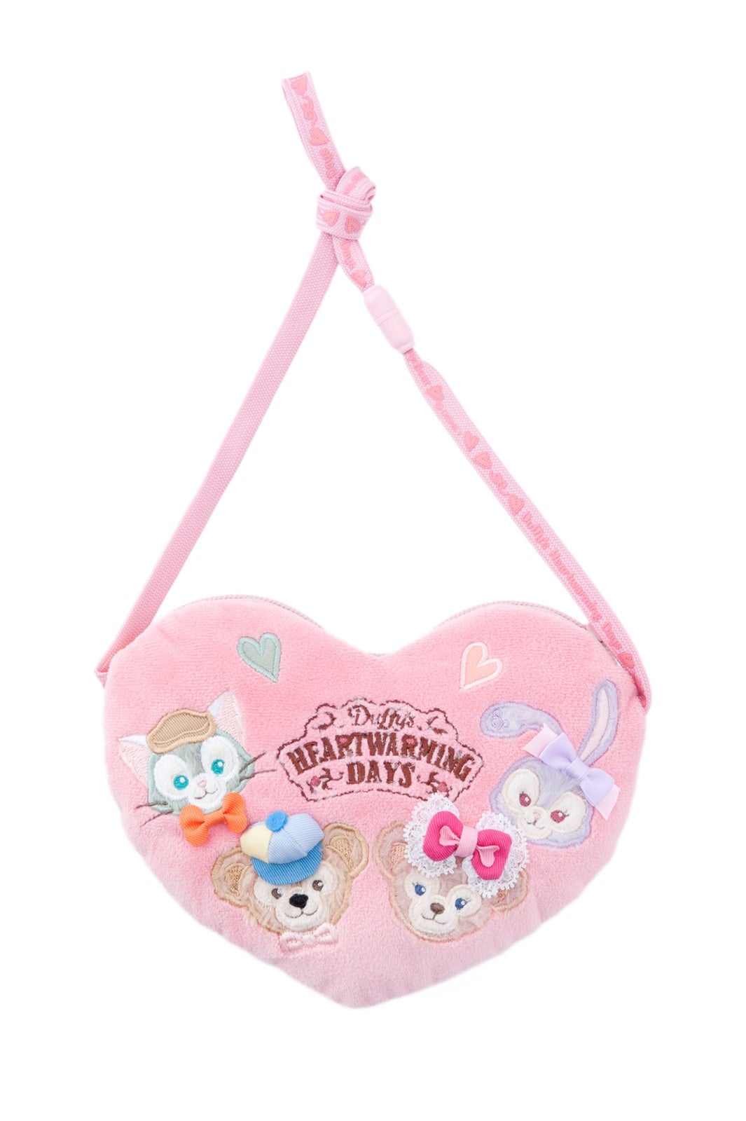 また、4人がハグをしている様子や、贈りものの形であるハートをモチーフにしたグッズを約30種類販売(1月8日より先行販売)。定番アイテムであるコスチュームセットのほか、ダッフィー&フレンズの特徴であるふわふわの触り心地をそのまま活かしたダッフィーとシェリーメイのぬいぐるみポシェットや、そばに置きたくなるようなクッション型のブランケットなども販売される。