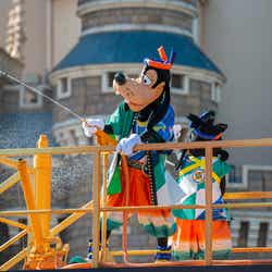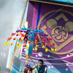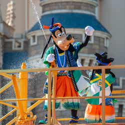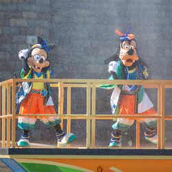 キャッスル・フォアコート、パレードルートでは和の夏祭りをイメージし、大量の水しぶきを浴びながら楽しめる、清涼感溢れるエンターテイメント「燦水!サマービート」を今年も公演。シンデレラ城前やパレードルートには大小5台のフロートが登場し、集まったゲストを盛り上げてショーがスタート。カラフルなコスチュームを身にまとったディズニーの仲間たちは、フロートから打ち上がる水しぶきに加えて自らも水を振りまきながら、威勢のいい掛け声や手拍子でゲストとともにヒートアップ。