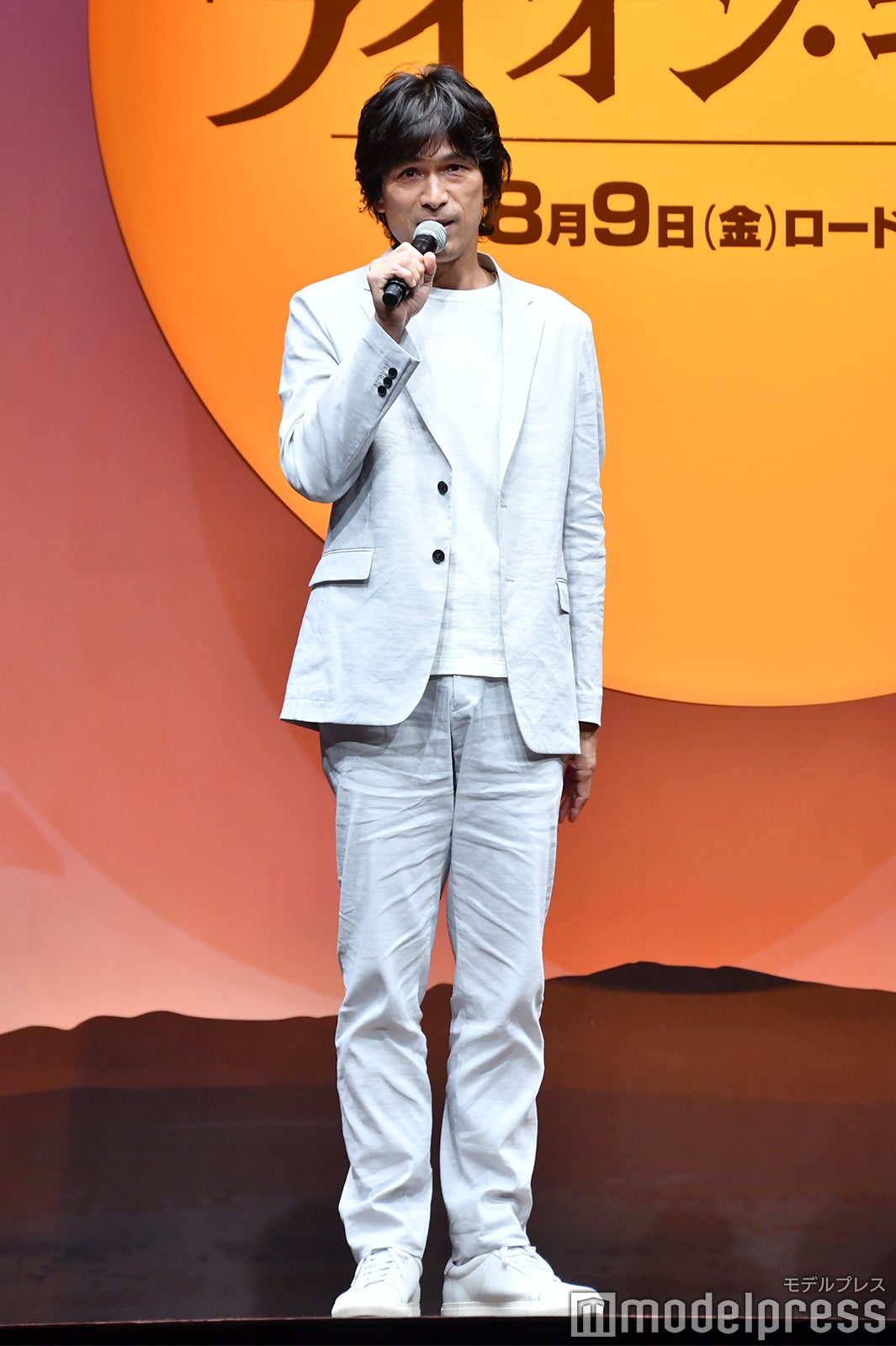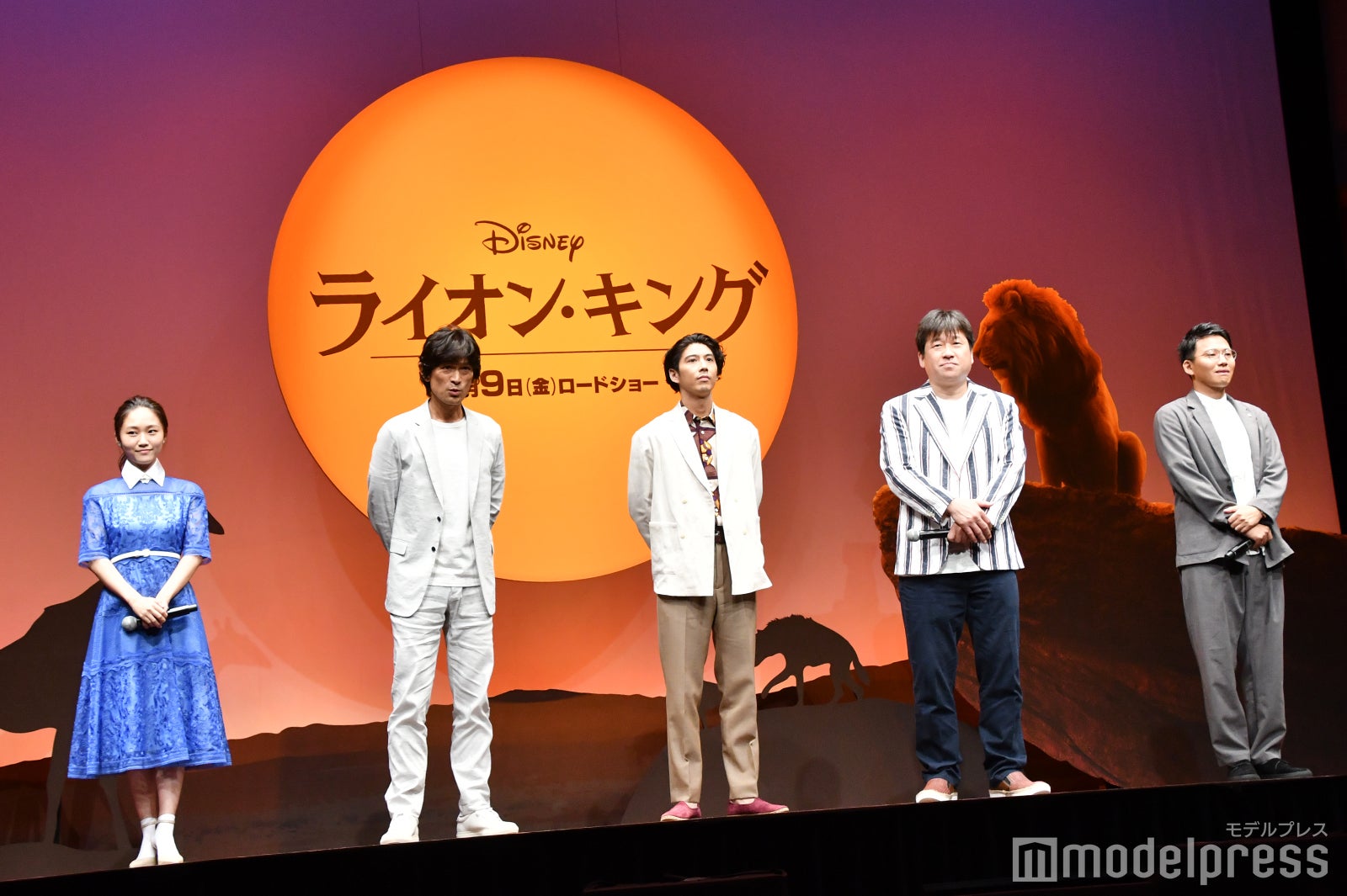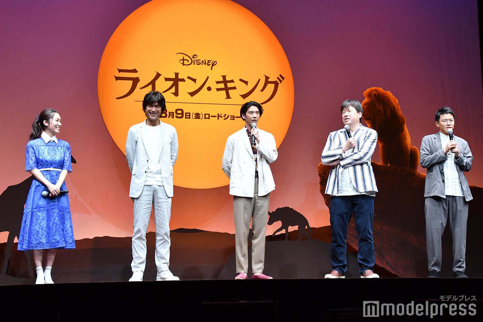 2016年に女優の榮倉奈々と結婚し、2017年に第1子が誕生した賀来は、友人が同作の舞台版作品に出演していることを紹介。「自分も小さな子どもがいるので『絶対に(主人公の)シンバ役をやりたいな』と思っていたら、(オーディションの)合格を頂きました。全身全霊でやらせて頂きました」と声を弾ませた。また、佐藤は「7歳の息子がおりまして」と話し始め、「私は役者ですが、子どもの教育上良いような役をあまりやったことがないのです。が、このお話を頂いたときに、『また息子と映画館に行ける!』と(思いました)」などとあいさつ。続けて、「好感度、上がったね!ありがとう。拍手はいらないよ!」と“佐藤節”全開で笑いを誘った。