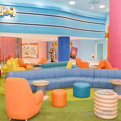 ひさしに大きなスリンキー・ドッグが描かれたエントランスを抜けると、広々したロビーが。すごろくをモチーフにした天井、床面にはパズルのピースがちりばめられ、壁の上部を走るゴーカートがデザインされており、カラフルな色使いも『トイ・ストーリー』らしさたっぷり。エントランスを抜けて左手奥、レックスが目印の場所がフロントデスクのため、宿泊時のチェックイン・アウトはこちらで。チルドレンズ・エリアでは映画『トイ・ストーリー』シリーズを上映しており、手続きの際や車の出庫時など、子ども連れゲストのちょっとした待ち時間に嬉しいスポットだ。
