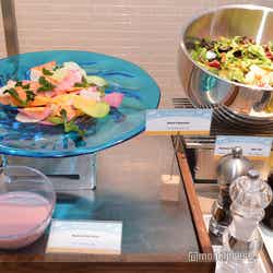 メニュー数は約50種類。ディナーからは、ポテトムースのエアリーななめらかさとコクが特長の「ポテトのムースピーマンソース」はウッディが、グリーンピースの味わいが濃く感じられる「ポテトとグリーンピースのタルト」はバズ・ライトイヤーがそれぞれモチーフとなっていたりと、ディズニーホテルらしいキャラクターをモチーフにしたメニューに注目。