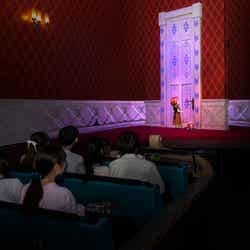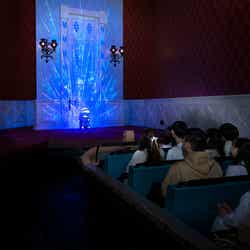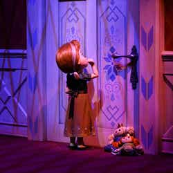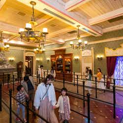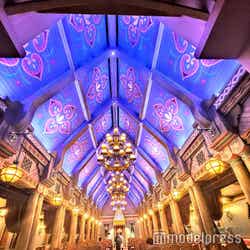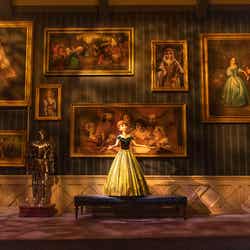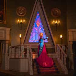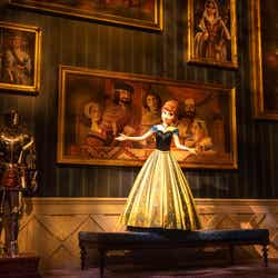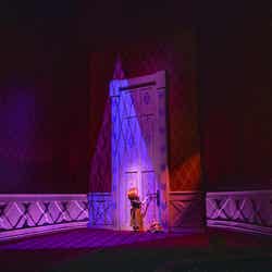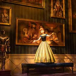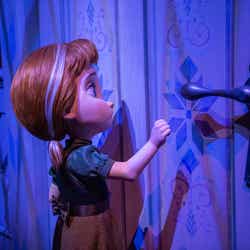 アトラクションまでの待機列には、壁にアナとエルサの幼い姿や、両親と描かれているものなど、たくさんの肖像画が掛けられている「ファミリールーム」や、部屋の中央に大きなオルゴールが置かれている「プレイルーム」など没入感満載。花が咲き乱れる城の温室では、霜と雪で覆われたガラス屋根から夕暮れの空が見え、遠くにオーロラが輝いているのもわかる。待機列内の部屋のどこかには“隠れミッキー”もあるかも…?