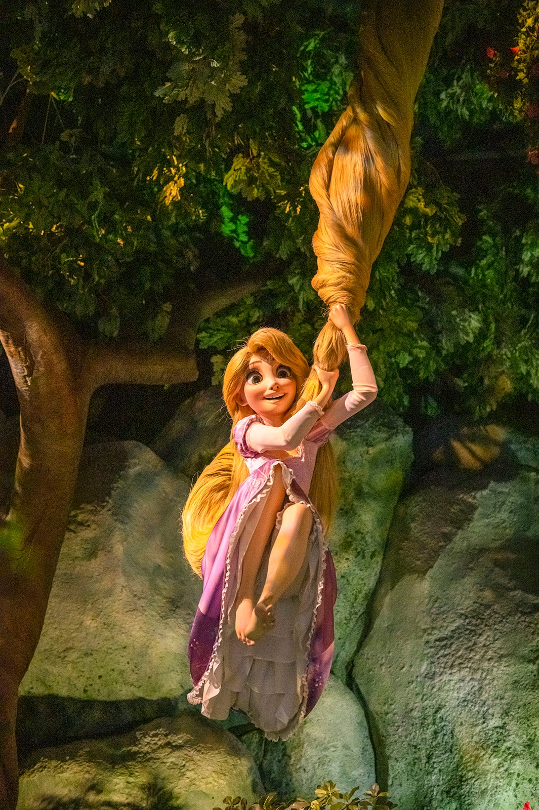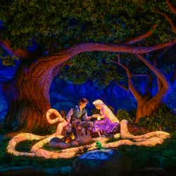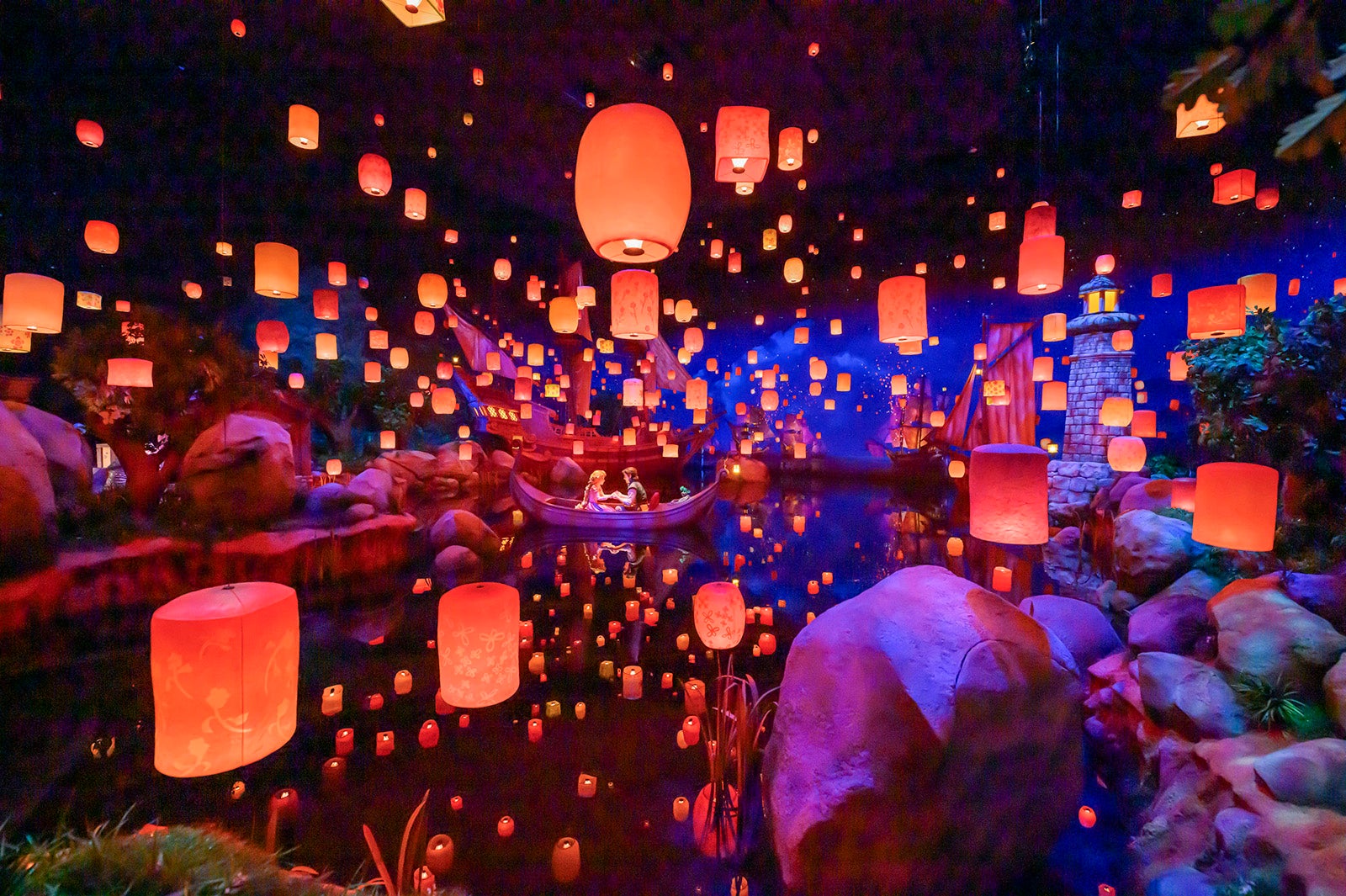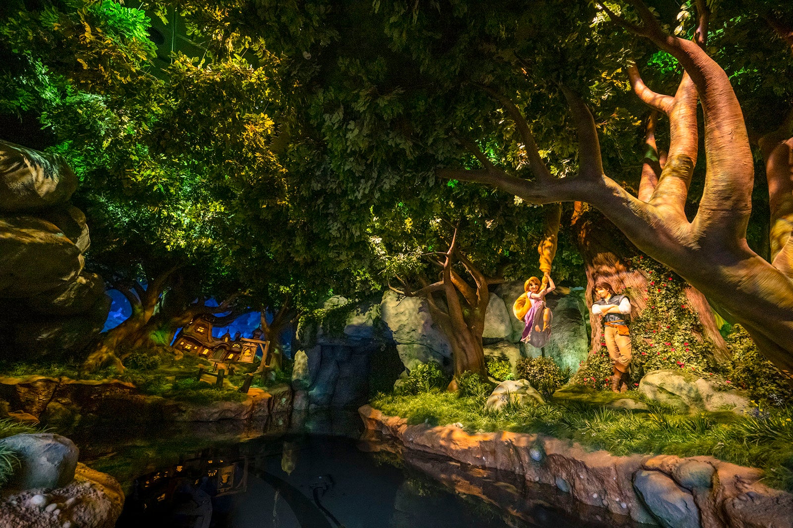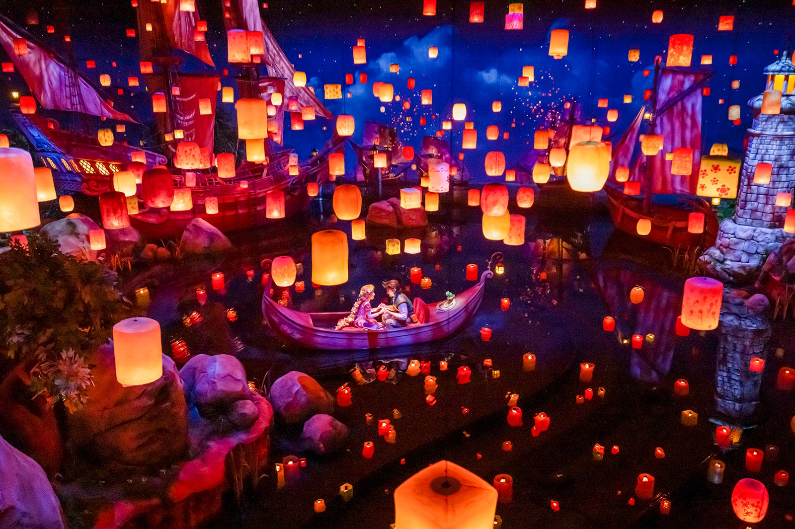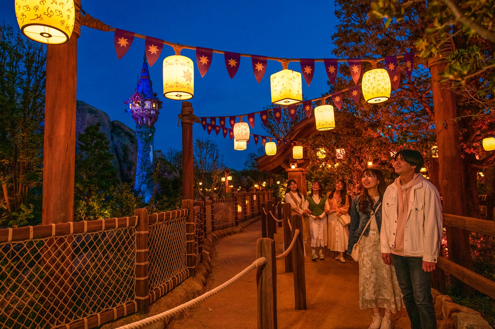 「ラプンツェルの森」では、森に足を踏み入れると、長い髪のプリンセス・ラプンツェルが小さい頃から暮らしていた塔がそびえ、ゲストを映画の世界に誘う。塔の上にいるラプンツェルは城下町を見ながら歌い、動きもある。世界のディズニーテーマパークで初めての、ライドに乗車してラプンツェルの物語を楽しむことができるアトラクション「ラプンツェルのランタンフェスティバル」では、ゲストはボートに乗って、年に一度のランタンフェスティバルへと向かうロマンティックな旅に出発。行く先では、ラプンツェルとお尋ね者の大泥棒フリン・ライダーと出会い、映画に登場するさまざまな場所で仲を深め、そしてランタンフェスティバルで2人が愛を語り合う姿を目にする。その先では、ラプンツェルとフリン・ライダーが「輝く未来」を歌い、ゲストは夜空いっぱいに広がる無数のランタンの灯りに包まれるロマンチックなひとときを過ごせる。