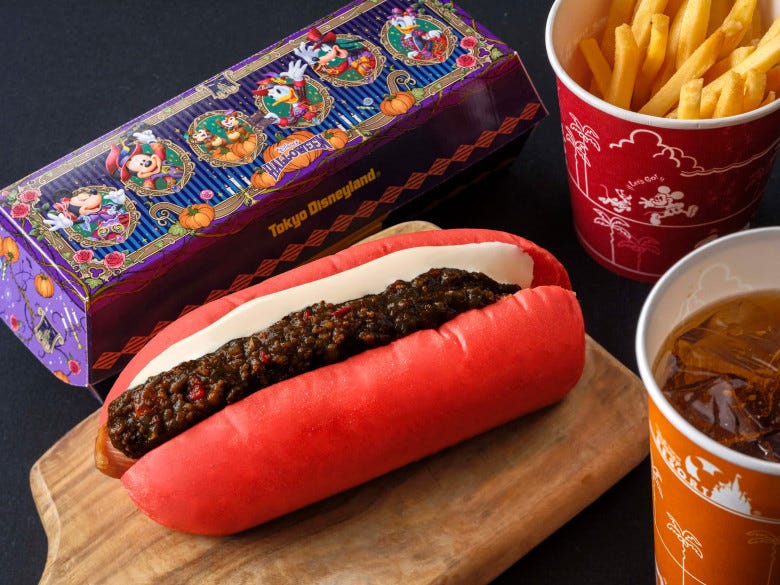 赤いパンに、黒いミートソースと白いチーズソースをトッピングし、クルエラ・ド・ビルの印象的なカラーリングを再現。甘辛いスウィートチリソースがアクセントとなり、味のバランスが絶妙です。