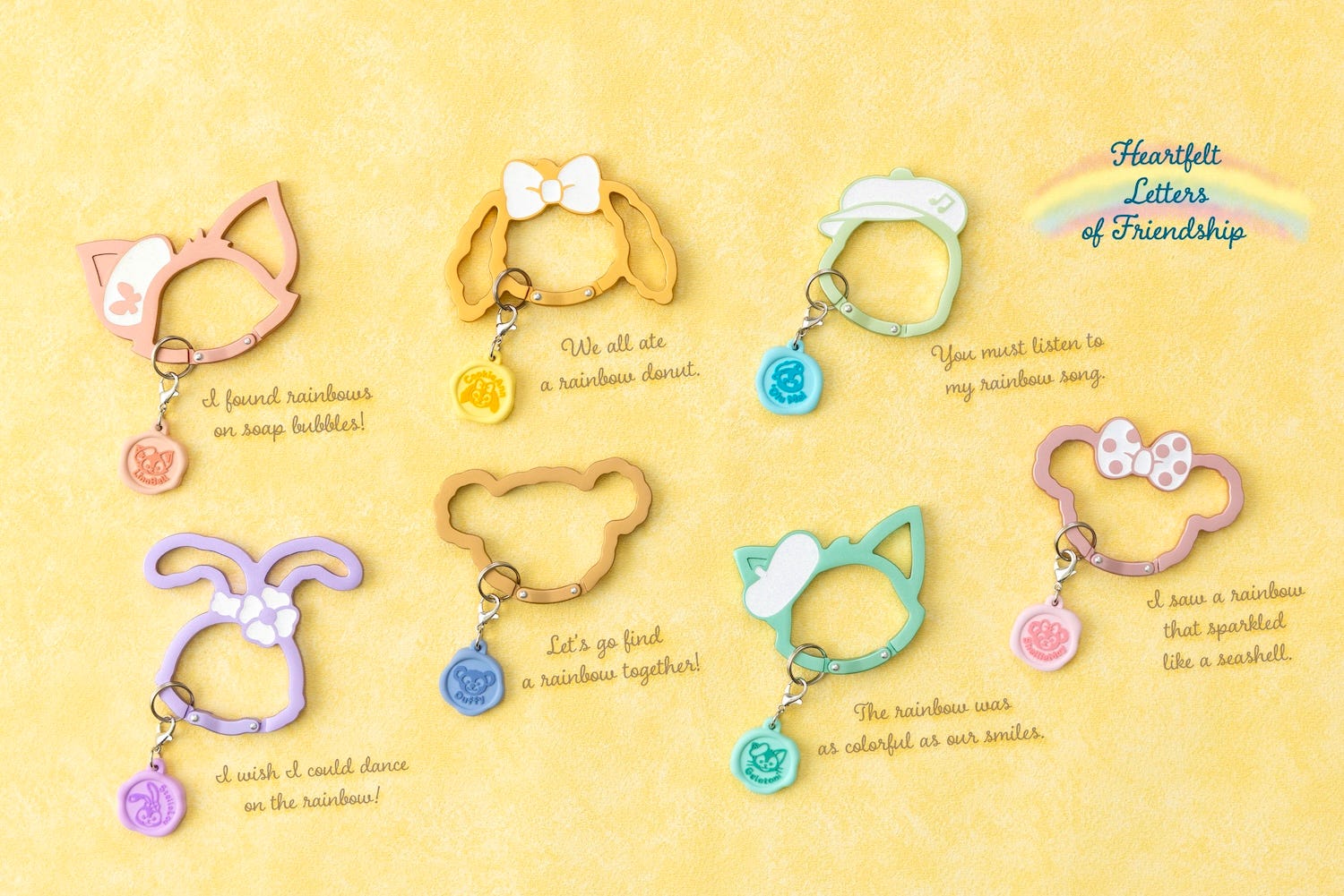 ぬいぐるみバッジは、ダッフィー&フレンズ7人が虹のようにさまざまな色合いのコスチュームを着ている「ダッフィー&フレンズのハートフェルト・レターズ・オブ・フレンドシップ」ならではのデザイン。また、ダッフィーのもこもこの耳と大きなリボンがついたベレー帽や、ミッキーへ書いた手紙からちょこんとダッフィーが顔をのぞかせているデザインのショルダーバッグ、大好きなミッキーにダッフィー&フレンズがあふれる思いを伝えている瞬間が大きく描かれたトートバッグや手紙を持っているくっつきぬいぐるみなどの身につけグッズが登場。