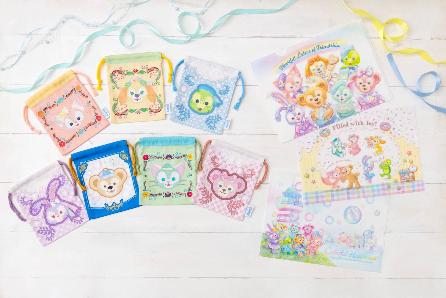 そのほか、東京ディズニーシーに飾られている「ダッフィー&フレンズ20周年:カラフルハピネス」のデコレーションをイメージしたデザインのきんちゃくやクリアホルダーセットが登場。きんちゃくは全部で7種類あり、どのデザインが出るかは袋を開けてからのお楽しみ。