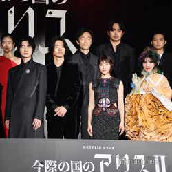 この日、ひときわ目立つド派手なヘアメイクと衣装で登場した仲。本作では、物語のカギを握る今際の国の国民・ミラを演じているが、撮影で苦労したことを聞かれると、「とりあえず台詞が長すぎて…。台詞が一番大変でした」と正直に吐露。これにはキャストからも笑いが起き、佐藤監督は「でも、神がかっていましたよ」とフォローするもタジタジだった。