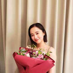 そして「楽屋では徳川吉宗を演じられた冨永愛さんより素敵な花束をいただきました」と、式のプレゼンターを務めた冨永からの花束を抱えたショットも公開。